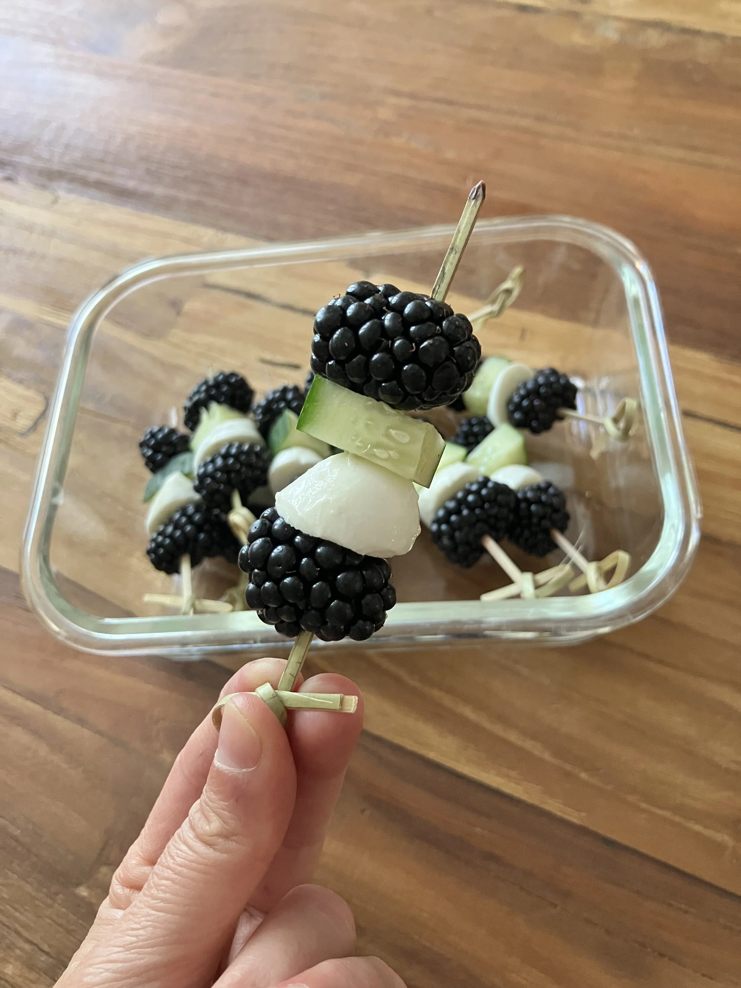 One of my traditions is to include a fruit, vegetable and cheese skewer with a light, citrusy vinaigrette drizzled on top. This time, I went with blackberry, cucumber, and mozzarella — simple, fresh, and full of color.