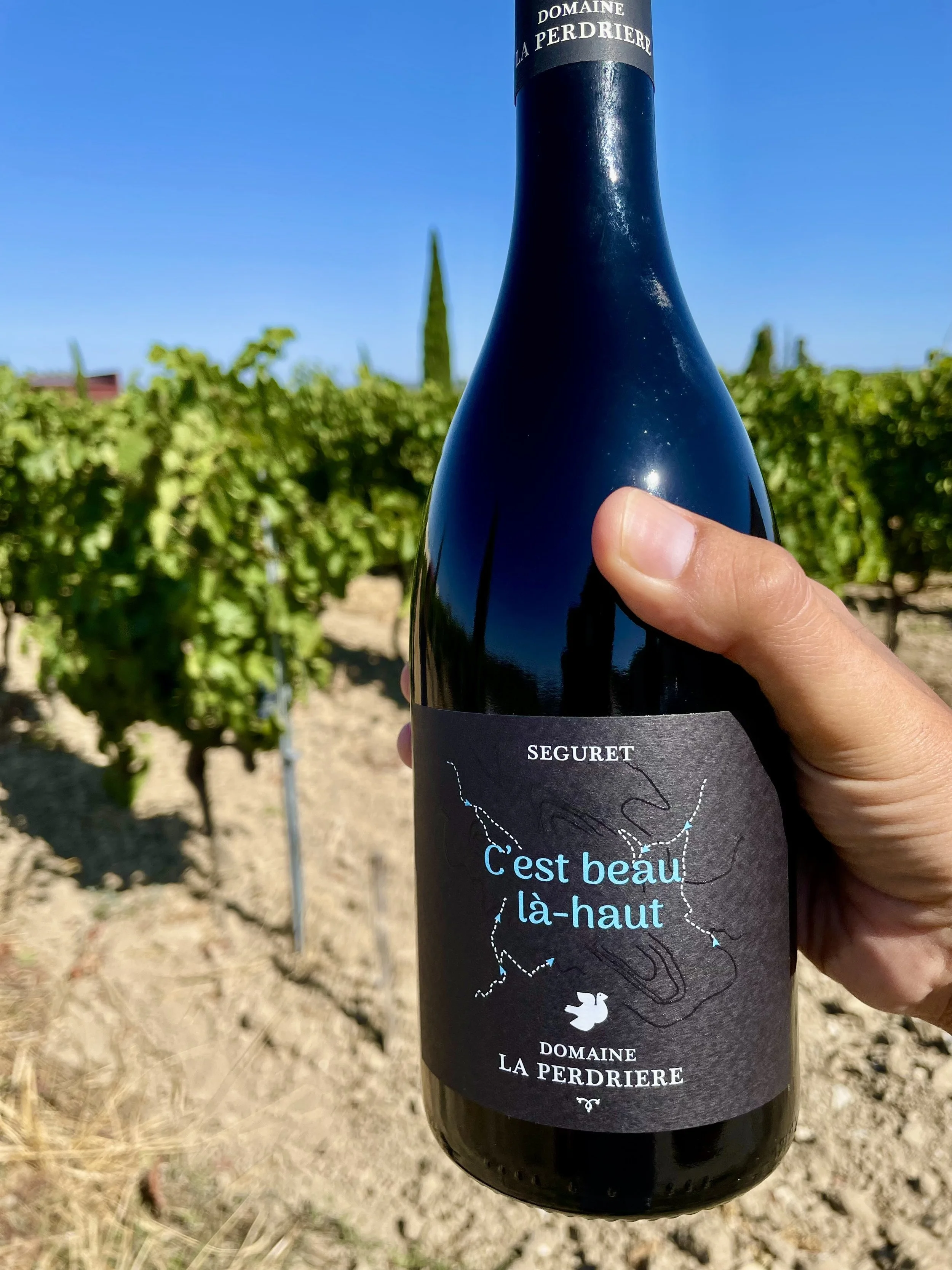 His hand immediately reached for a dark bottle labeled C’est Beau, Là-Haut, or “It’s beautiful up there.”