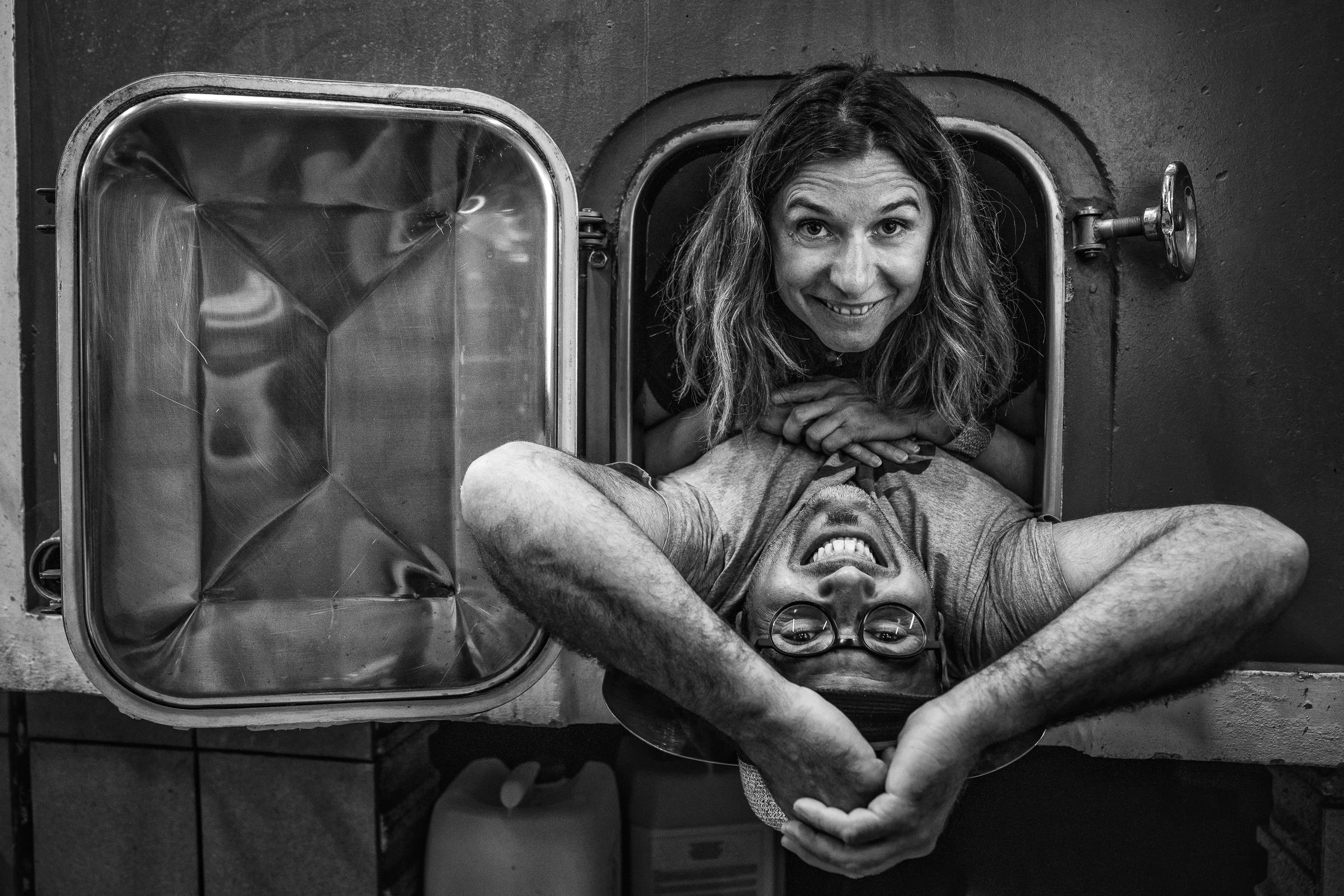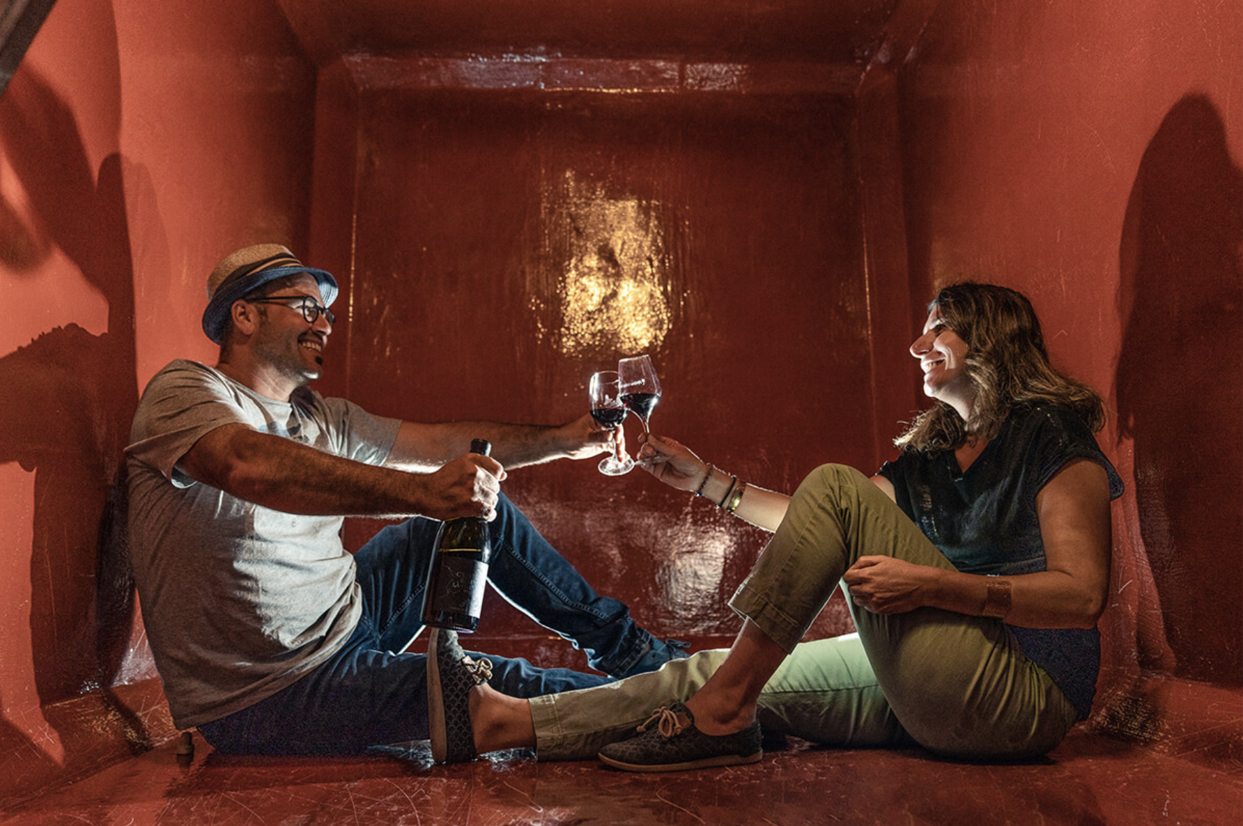 I turned my phone toward him as the photos on the domaine’s website slowly filtered past. For a moment it felt less like browsing a winery’s page and more like flipping through the feed of two friends documenting their adventures in winemaking. In one image, the couple lay flat inside an empty wine vat, grinning up at the camera as they popped their heads through the round metal hatch. In another, they sat inside a fermentation tank with their legs stretched out between them, raising their glasses in a quiet toast while the cellar light reflected softly off the curved red walls around them.