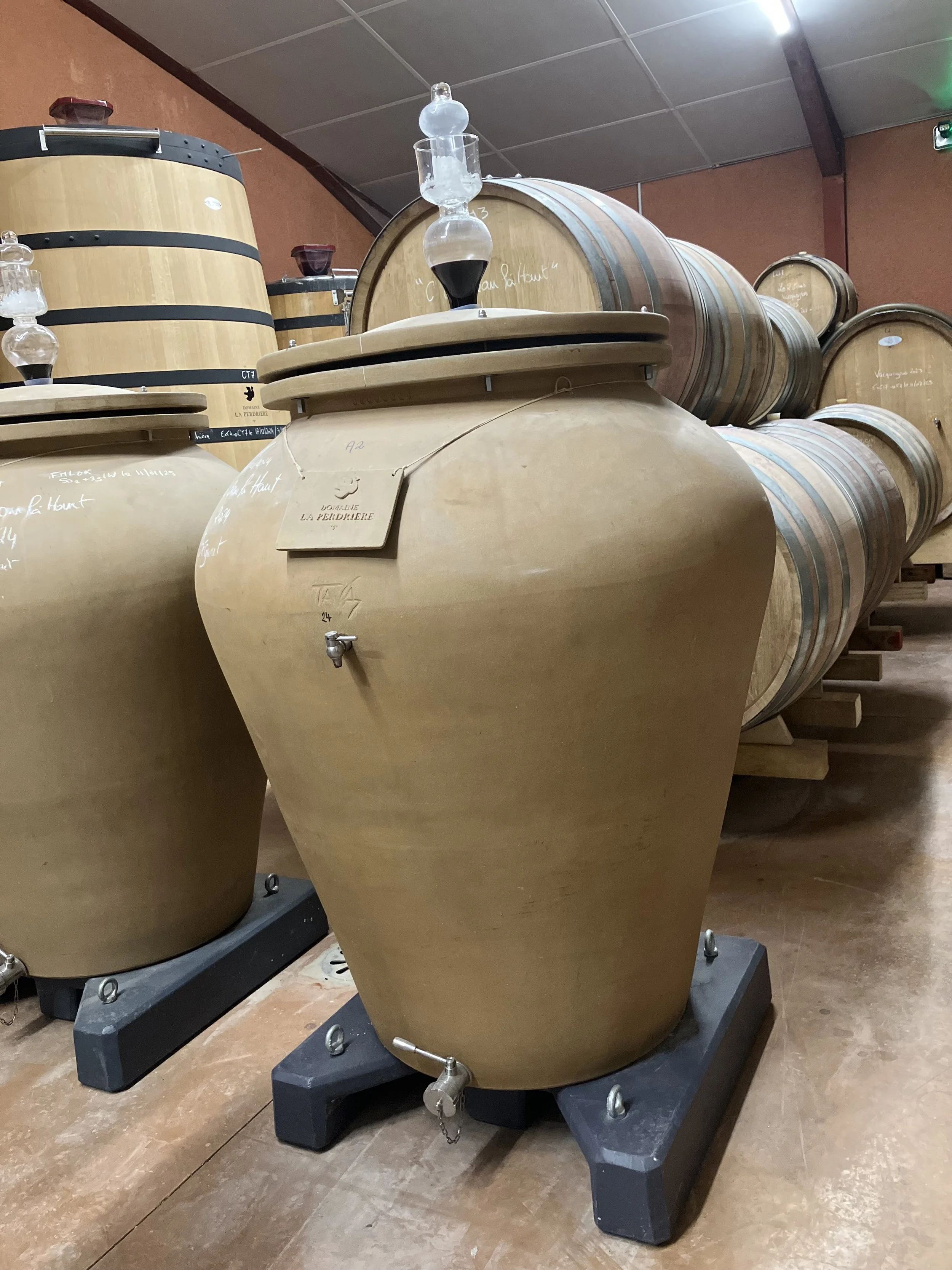 They led us through the door at the back of the room, and the space opened suddenly into a bright cellar. Sleek, oversized barrels stood upright in tidy rows along the perimeter, but my eye was drawn immediately to the center, where large clay amphorae rested on sturdy bases, their rounded forms topped with delicate glass airlocks quietly bubbling. It was the first time I had seen this style of vessel used in a working cellar, and it caught my attention.