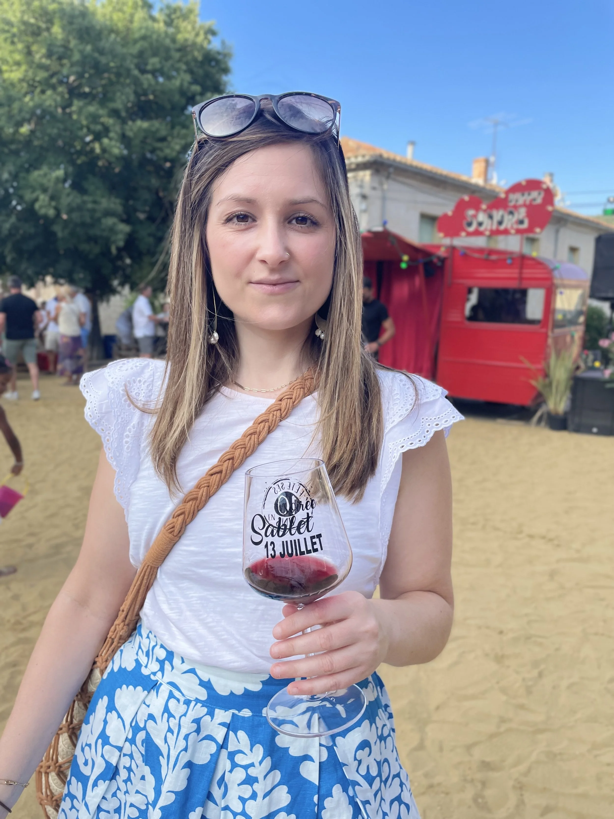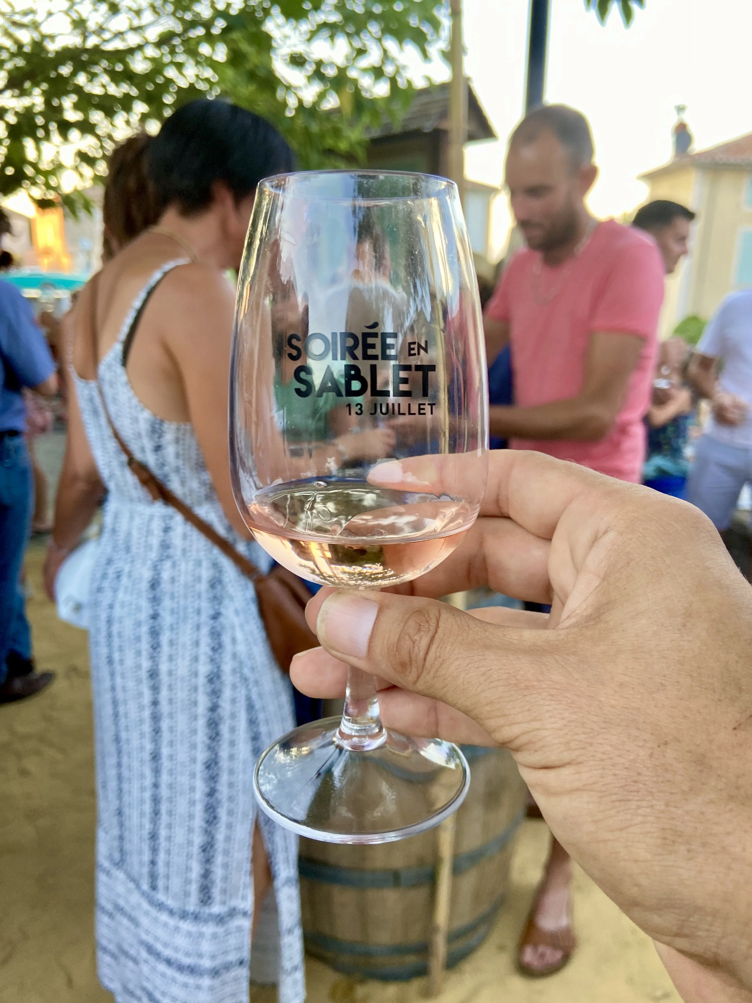 “She said we take the glasses and make our way from domaine to domaine,” gesturing toward the wide stretch of sand where the wine barrels doubled as tasting tables.